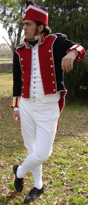 (Izq.) Manga de morrión de oficial del Regimiento Fijo de Buenos Ayres, hacia 1800, la confección de nuestra manga esta basada en este original existente en el Museo del Cabildo de la ciudad de Buenos Aires. |